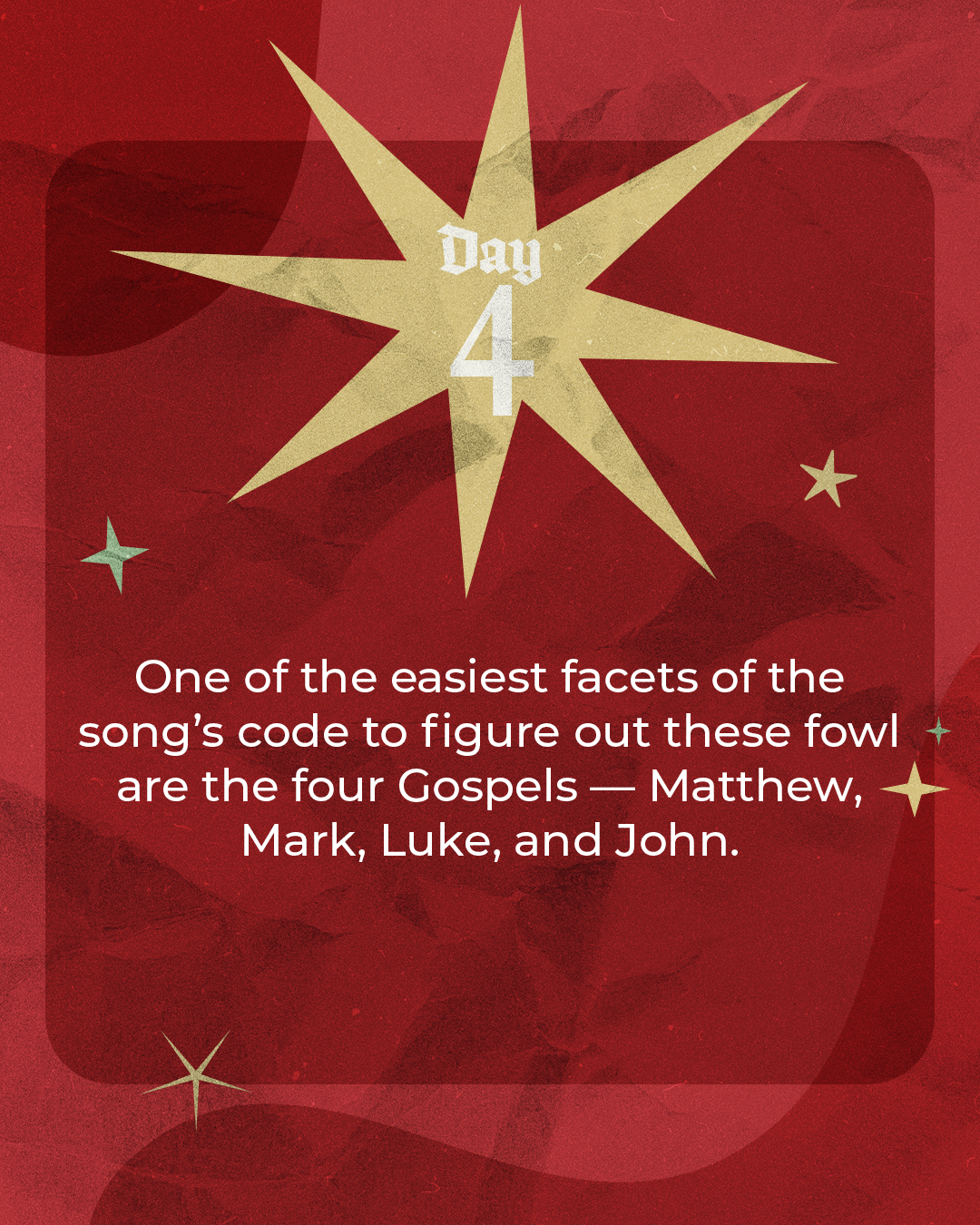 On the fourth day of Christmas, my true love sent to me Four calling birds, Three French hens, Two turtle doves, And a partridge in a pear tree.